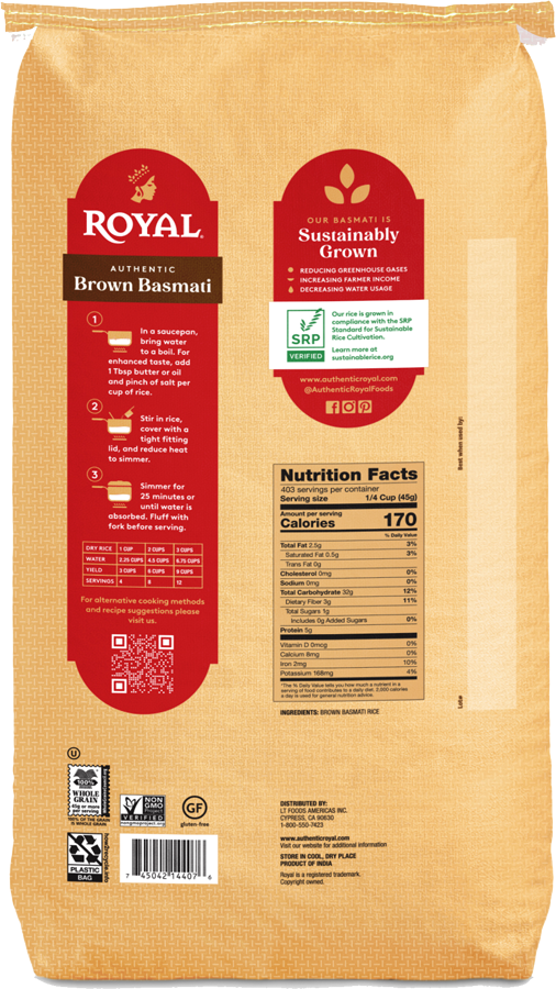 Truly authentic brown basmati can only come from the sub-continent of India, where perfect conditions produce some of the world's finest rice. After harvesting, we carefully remove the hull. This preserves the germ and bran layers and results in a highly nutritious whole grain. Enjoy this delicious brown basmati as a main course, side dish, in salads, or in stuffings. Our brown basmati rice is grown in compliance with the SRP standard for Sustainable Rice Cultivation.